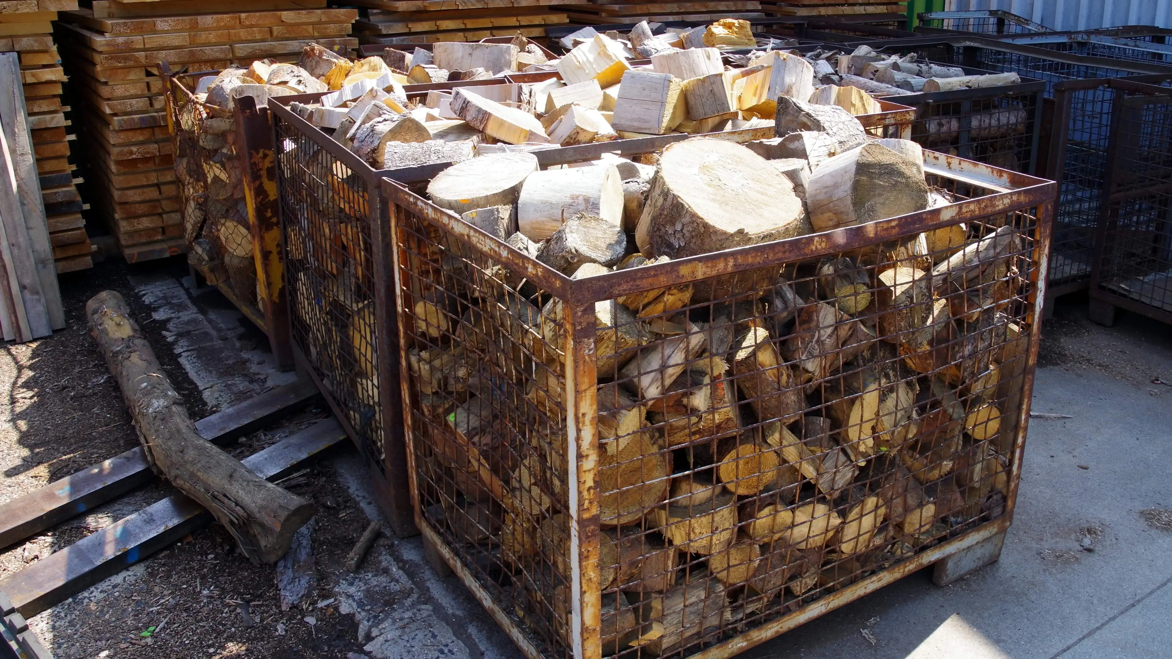 Kurzes Brennholz in Kisten, Kleinholz u. a.